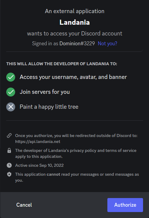We use the "Join servers for you" permission so that we can join the Landania Discord server if we haven't already!