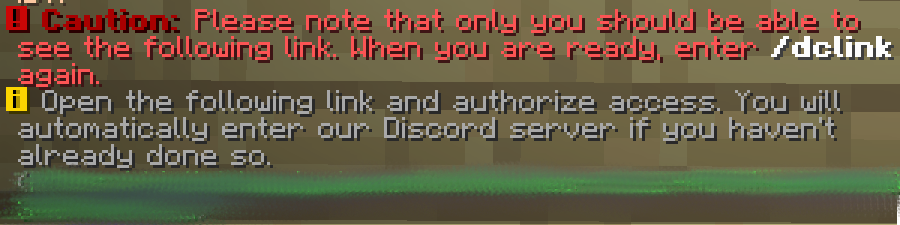 In a few seconds you can verify yourself on our Discord server, please use the command <mark style="color:green;">/dclink</mark> in the game to do so. You will see a link in the chat that you have to click on: