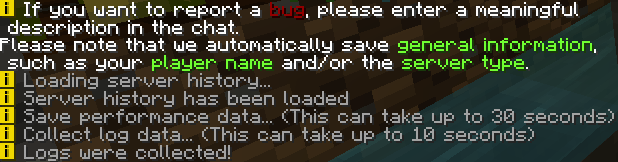 To report a bug, simply type the command <mark style="color:green;">/bug</mark> in the chat. Our system will ask you for a detailed description of the bug. Please try to describe the issue as understandable as possible, so that we know what you mean.